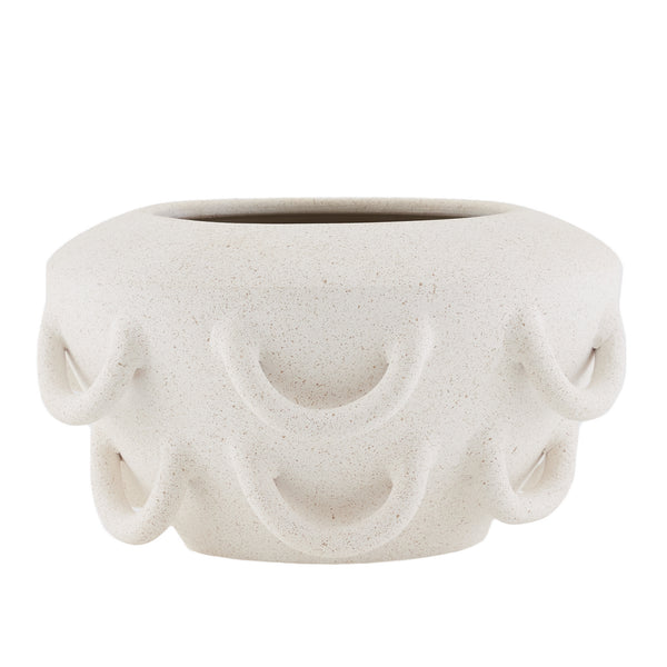 The handmade Paloma vase, created in a speckled ivory finish, volcanic-glazed ceramic with large lug-handle accents, takes its inspiration from the love handles used in ancient Roman pottery. Filled with foliage or on its own, the contemporary artifact adds old-meets-new refinement to any surface. Finish will vary.