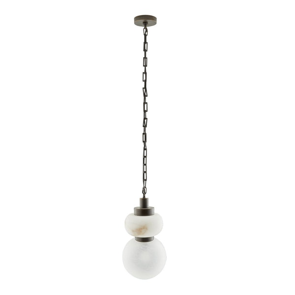 Rendered in a totemic silhouette, the Rosemont casts a soft glow in luxurious white alabaster and matte swirl glass. The pendant is accented with an English bronze steel band and decorative rectangular chain-links. Finish will vary.