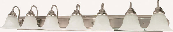 The Ballerina 7 light, 48 inch vanity fixture features a polished chrome finish, accented with alabaster glass bell shades. Illuminate bathrooms, hallways, and foyers with this elegant lighting solution for the home. Sleek and traditional, impress your guests with this seven light vanity.