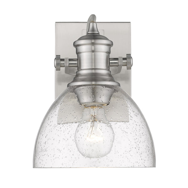 Experience timeless charm in your home with the Yep by Golden Lighting Hines 1-light Vanity. Featuring a glass shade and a Brushed Champagne Brass frame, it establishes a gentle and inviting atmosphere. The Seeded Glass shade, with its antique-inspired texture created by air bubbles, adds vintage character and artisanal charm to the design, enhancing the light that diffuses through for a warm ambiance. Perfect for bathrooms and dressing areas, this vanity light is damp location rated for use in semi-enclosed spaces. The adjustable directional heads allow you to highlight specific areas, making it adaptable to your lighting needs. Overall dimensions are 6.88"W x 8.75"H x 8.25"D, requiring 1 E26 medium base bulb (not included) with a maximum wattage of 60, allowing flexibility in brightness and warmth. Elevate your decor with this classic yet chic vanity light, exemplifying the quality and elegance that Yep by Golden Lighting is renowned for.
