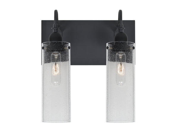 The Juni 10 Blue Vanity is a transitional bath design composed of a transparent blue glass cylinder, with an interesting bubble pattern blown randomly throughout the glass. Mounted off the broad canopy with timeless gooseneck socketholders, the pleasing play of light through each shade`s bubble accents make for a striking affect along with the prominent display of the lamp filament behind the glass. These stylish and functional luminaries are offered in a beautiful Black finish.