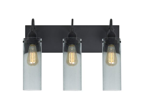 The Juni 10 Blue Vanity is a transitional bath design composed of a transparent blue glass cylinder, with an interesting bubble pattern blown randomly throughout the glass. Mounted off the broad canopy with timeless gooseneck socketholders, the pleasing play of light through each shade`s bubble accents make for a striking affect along with the prominent display of the lamp filament behind the glass. These stylish and functional luminaries are offered in a beautiful Black finish.
