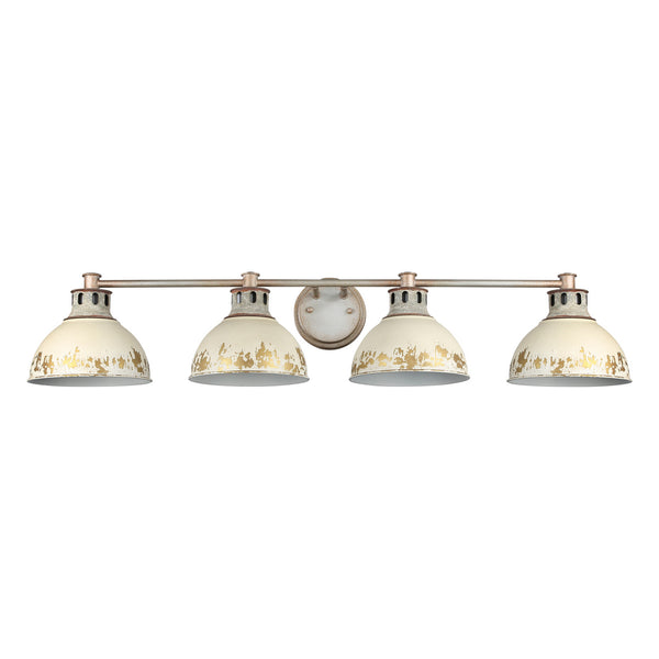 Bring rustic charm into your bathroom with the Golden Lighting Kinsley 2-light Vanity. Featuring a metal shade and an aged galvanized steel frame, it creates a welcoming atmosphere. The Antique Black Iron finish adds depth with its heavily distressed, pitted surface and warm gold undertones. This vanity light is damp location rated, making it perfect for semi-enclosed spaces while providing practical task illumination. It requires 2 E26 medium base bulbs (not included), max 100 wattage per bulb, and measures overall dimensions of 19.25"W x 7.88"H x 9.25"D. Each piece is hand-painted and showcases unique variations that enhance its artisanal charm, ideal for enhancing both style and functionality in your home.