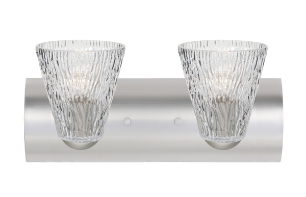 The Nico 5 Clear Stone Vanity is a contemporary bath design, employing a softly radiused housing and sparkling textured shades. Our Clear Stone glass is a clear blown glass with an outer texture of coarse sandstone. Inspired by the elements of nature, the appearance of the surface resembles the beautiful cut patterning melting ice over a rock formation The vanity fixture is equipped with sleek arcing diecast lampholders and matching radiused rectangular canopy. These stylish and functional luminaries are offered in a beautiful Satin Nickel finish.