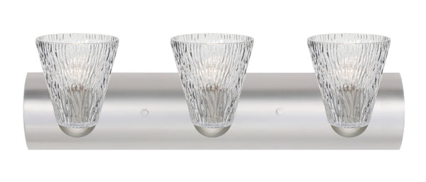 The Nico 5 Clear Stone Vanity is a contemporary bath design, employing a softly radiused housing and sparkling textured shades. Our Clear Stone glass is a clear blown glass with an outer texture of coarse sandstone. Inspired by the elements of nature, the appearance of the surface resembles the beautiful cut patterning melting ice over a rock formation The vanity fixture is equipped with sleek arcing diecast lampholders and matching radiused rectangular canopy. These stylish and functional luminaries are offered in a beautiful Satin Nickel finish.