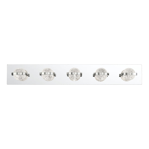 This luxurious bath bar features elegant ice crystal orbs that are fastened by a center ring. The multifaceted surface reflects light in a dazzling way onto the backplate for added glow. A glamorous addition to any space, these lights are sure to add ambience.