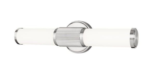Fluted and smooth design elements create impeccable textural contrast for a modern LED vanity bath light. A sleek brushed nickel finish highlights its steel construction, which boasts a beveled wall plate and decorative end caps. From the Solange collection, this sconce is a chic choice that offers inviting illumination with opal glass shades.