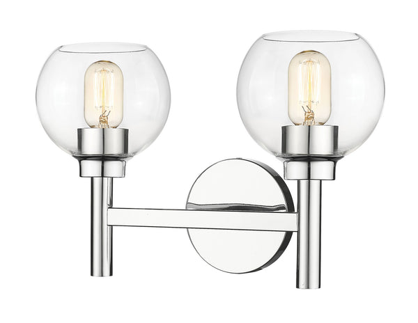 A contemporary two-light vanity sconce boasts graceful curves that create its perfect circle design elements. Its familiar, torch-inspired silhouette is adorned with a brushed gold finish for warm, glamorous flair in an entry or bathroom. A pair of open-edged, clear glass globe shades adds precision, and this fixture can be mounted with lights either up or down to best suit your space and preference.