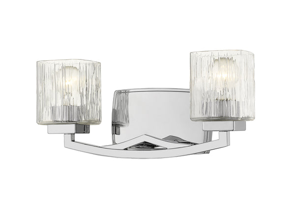 Metropolitan flavor makes its way into the design of this brushed nickel two-light vanity light. Add character to a contemporary space with a stylish steel frame that hosts a pair of chiseled clear glass shades.