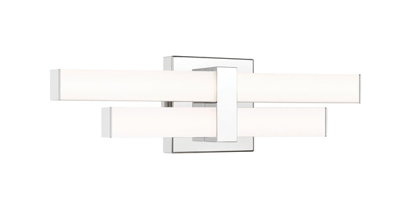 Geometry and minimalism play well together in the crisp, modern design of this two-light vanity light, an intriguing way to illuminate a bath space with compatible contemporary elements. Symmetry and balance collude in a fixture created of brushed nickel finish aluminum and a pair of bar diffusers forming a tapered silhouette, creating dimmable ambient lighting with customized white color values.