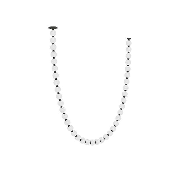 The Perle by Sean Lavin is a stunning extension to the popular Collier Series, now offered in soft white glass to provide a different design presence in a room. Available in multiple-length strands for the ultimate customization. Perle can be hung straight down in pendant form or draped from two mounting points for a striking chandelier utilizing the surface canopy or more minimal remote driver canopy. Interweave individual stands to create incredible light sculptures with stunning illumination. The natural brass connectors are custom engineered to support the glass and add additional beauty to the piece. Available with remote or surface-mounted driver options. Predetermined length options allow easy ordering with virtually unlimited versatility—contact the factory for custom configurations. Patent pending.