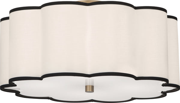 Aged Brass Finish Axis Flushmount With Scalloped Fondine Fabric Shade with Contrasting Trim - Axis features a scalloped design that diffuses the light in a most inviting way and also adds an elegant touch that is subtle and charming.