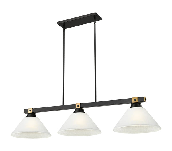 Brass details bring the perfect hint of warmth and sophistication to this modern three-light linear billiards pendant. Perfect for gaming and dining tables or kitchen islands, its elongated profile features a matte black finish that pairs perfectly with soft white shades for a clean, precise look.