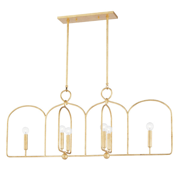 With its open, arched metal frame and gold leaf or aged iron finish, Mallory makes a stylish statement. Clear, round bulbs atop sleek, straight candle holders create a beautiful contrasting effect. Available as a sconce, pendant or linear, each fixture hangs from a round metal loop giving the piece a feeling of motion.
