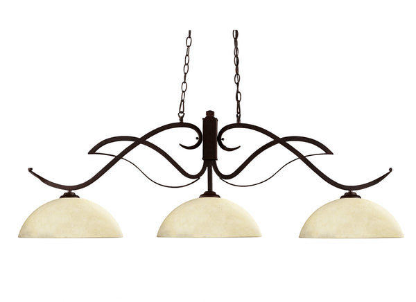 Bold flowing curves define this three light fixture. Finished in bronze, this fixture uses dome golden mottle glass shades to create a contemporary, yet classic look. This fixture includes 72'' of chain on both sides to ensure a perfect hanging height.