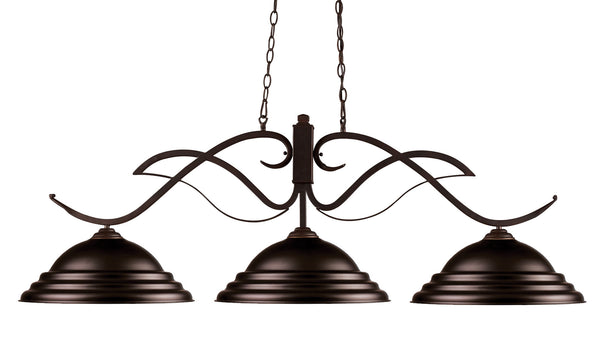 Bold flowing curves define this three light fixture. Finished in bronze, this fixture uses dome golden mottle glass shades to create a contemporary, yet classic look. This fixture includes 72'' of chain on both sides to ensure a perfect hanging height.