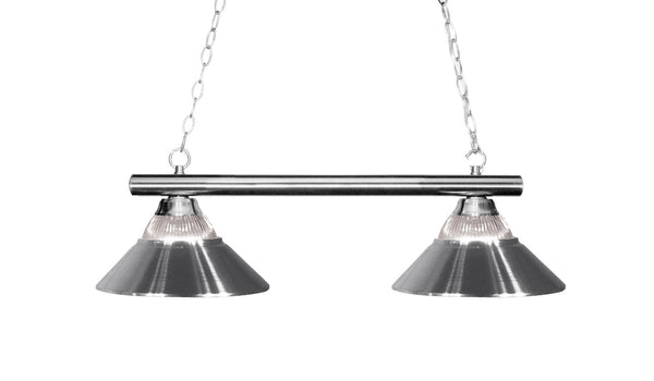 The simple styling of this two light fixture creates a classic statement. Finished in chrome, this two light fixture uses satin gold metal shades to compliment its classic look, and 36'' of chain per side is included to ensure the perfect hanging height.