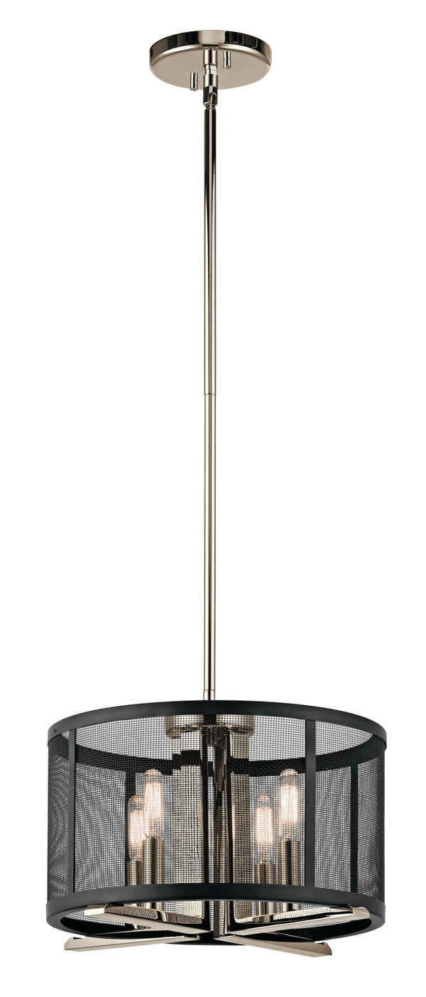 Titus 4 Light Pendant/Semi Flush features black mesh ironwork, giving off an industrial accent to a modernly sleek collection. The Pendant/Semi Flush has a Polished Nickel finish for a dynamic effect. This Pendant is easily convertible to a Semi Flush.