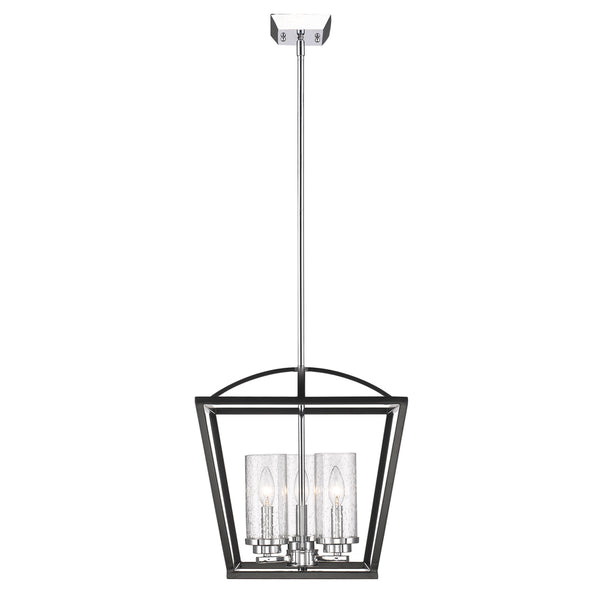 Bring transitional elegance into your home with the Golden Lighting Mercer 3-light Pendant in Matte Black. Featuring a glass shade and a matte black frame, it creates a welcoming atmosphere. The seeded glass shade, with its distinctive air bubbles, adds vintage character while gently diffusing light for a cozy glow. The matte black finish is both timeless and versatile, seamlessly fitting into various decor styles from minimalist to contemporary. Ideal for dry locations like bedrooms, living rooms, and hallways, this pendant is easily mounted on sloped ceilings with adjustable height from 18.5" to 60.5". Overall dimensions of 15"W x 15.5"H x 15"D and requires three E12 candelabra base bulbs (60W max) to illuminate. This fixture promises to upgrade your space with sophisticated style and enduring quality.