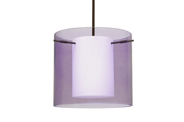 The Pahu is a distinctive double-glass pendant, with an inner opal cylinder centered within a transparent outer glass Our Trans-Amethyst colored blown glass complements the soft white Opal cased glass, which can suit any classic or modern decor. Opal has a very tranquil glow that is pleasing in appearance, as the Trans-Amethyst glass sparkles with the accents from that glow. The smooth satin finish on the opal’s outer layer is a result of an extensive etching process. This blown glass combination is handcrafted by a skilled artisan, utilizing century-old techniques passed down from generation to generation. The cable pendant fixture is equipped with three (3) 10` silver aircraft cables and 10` AWM cord set, and a low profile flat monopoint canopy. These stylish and functional luminaries are offered in a beautiful brushed Bronze finish.