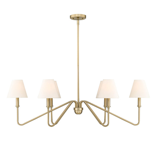 Bring modern elegance into your home with the Yep by Golden Lighting Kennedy 6-light Island Light. Featuring a Brushed Champagne Brass frame, it creates a welcoming atmosphere. This linear suspension light offers a customizable design with a minimalist aesthetic, perfect for modern interiors. The refined texture beautifully catches the light to add a touch of luxury. The Brushed Champagne Brass finish blends warmth and softness, ideal for adding contemporary style. Designed specifically for kitchen islands, this fixture is Dry Location Rated, ensuring safety in indoor spaces not subject to moisture. It's sloped-ceiling compatible and adjustable in height, from 9.375" to 49.875", making installation straightforward and flexible. Overall Dimensions: 36.75"W x 9.38"H x 9.38"D. Requires 6 E12 Candelabra base bulbs (not included), max 60 watt per bulb. Infuse your living area with quality craftsmanship and modern design.