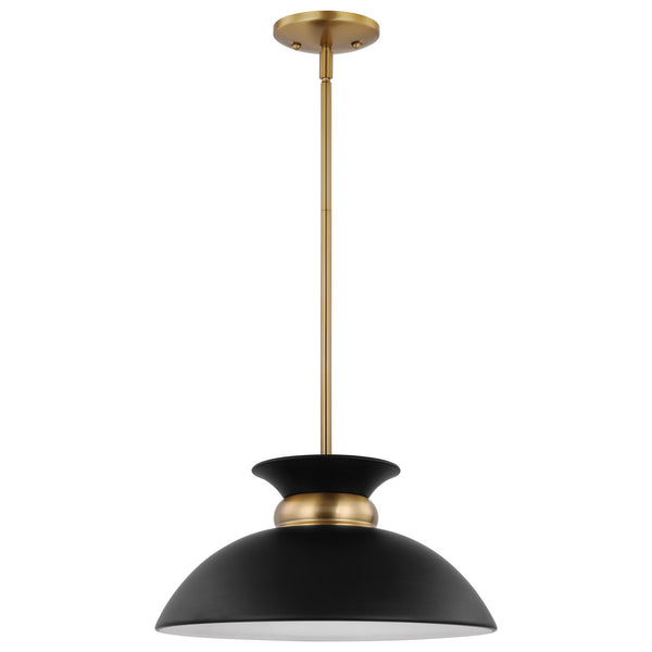 The simplistic design of the Perkins small pendant is understated, yet refined. The decorative burnished brass band on the shallow-dome metal shade cinches at the top, creating the illusion of a swirling skirt. The white interior of the shade provides maximum light reflection and is complemented with a matte black finish on the exterior. No longer just for the kitchen, this beautiful pendant will give any room in your home a facelift.