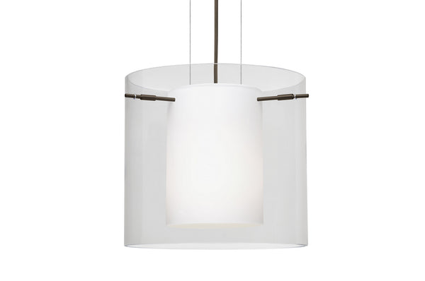 The Pahu is a distinctive double-glass pendant, with an inner opal cylinder centered within a transparent outer glass Our Trans-Amethyst colored blown glass complements the soft white Opal cased glass, which can suit any classic or modern decor. Opal has a very tranquil glow that is pleasing in appearance, as the Trans-Amethyst glass sparkles with the accents from that glow. The smooth satin finish on the opal’s outer layer is a result of an extensive etching process. This blown glass combination is handcrafted by a skilled artisan, utilizing century-old techniques passed down from generation to generation. The cable pendant fixture is equipped with three (3) 10` silver aircraft cables and 10` AWM cord set, and a low profile flat monopoint canopy. These stylish and functional luminaries are offered in a beautiful brushed Bronze finish.