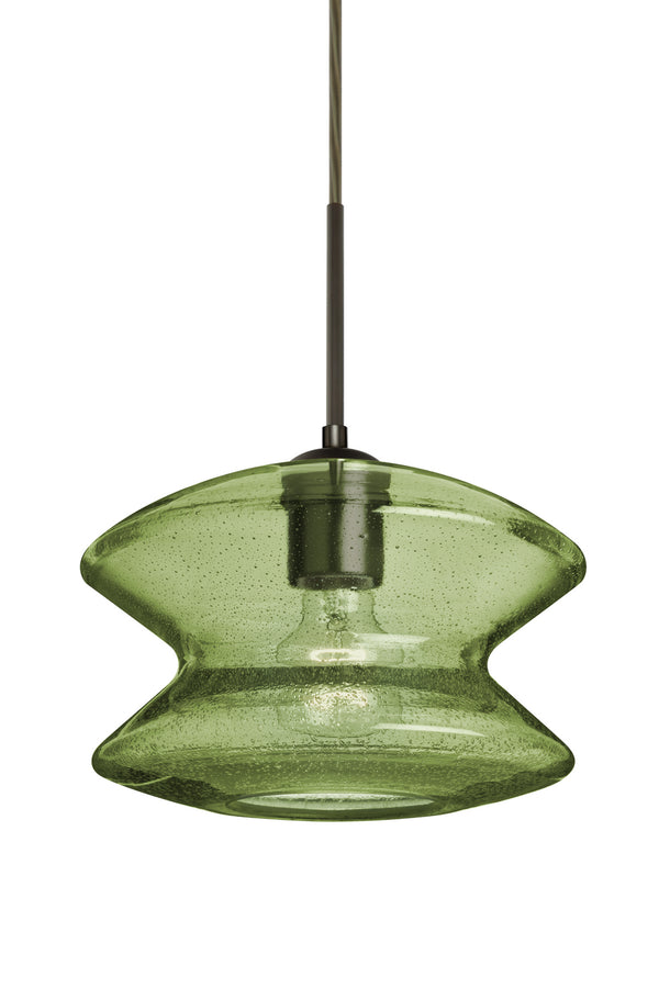 The Zen Blue Pendant is a transitional design composed of a transparent blue ``Hour-Glass`` shaped glass , with an interesting bubble pattern blown randomly throughout the glass. The pleasing play of light through the shade`s bubble accents makes for a striking affect, created by the exposed light source positioned inside the shade. The cord pendant fixture is equipped with a 10` SVT cordset and an ``Easy Install`` dome monopoint canopy. These stylish and functional luminaries are offered in a beautiful brushed Bronze finish.