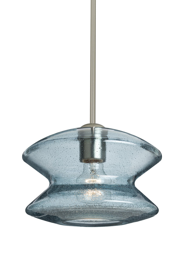 The Zen Blue Pendant is a transitional design composed of a transparent blue ``Hour-Glass`` shaped glass , with an interesting bubble pattern blown randomly throughout the glass. The pleasing play of light through the shade`s bubble accents makes for a striking affect, created by the exposed light source positioned inside the shade. The cord pendant fixture is equipped with a 10` SVT cordset and an ``Easy Install`` dome monopoint canopy. These stylish and functional luminaries are offered in a beautiful brushed Bronze finish.