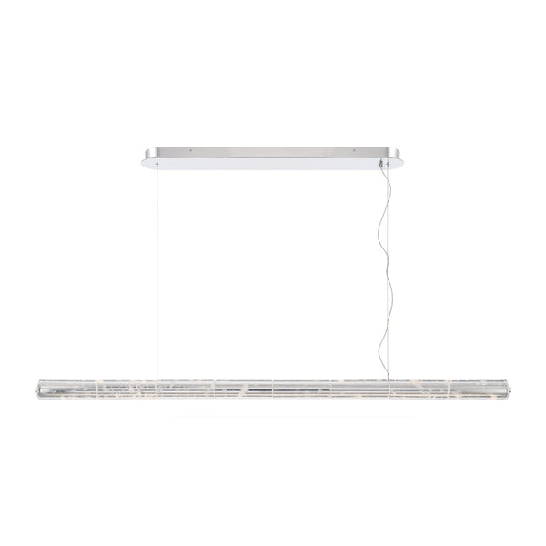 Bring modern glam elegance into your home with the Golden Lighting Crystallo Integrated LED Island Light. Featuring a crystal shade and a polished nickel frame, it creates a welcoming atmosphere. The crystal shade is crafted from a solid cylinder of cloudy crystal, showcasing delicate, wispy white inclusions that swirl within, designed for unique light diffusion. This exquisite shade enhances the clarity and depth of the material, transforming light into a beautifully diffused glow. The polished nickel finish offers a luxurious shine, adding sophistication and versatility for both traditional and contemporary designs. Ideal for kitchen islands, this fixture is rated for dry locations, ensuring safety in indoor spaces. It is compatible with sloped ceilings and features an adjustable height of 2.75" to 124.38". Overall dimensions are 64.38"W x 2.75"H x 2.75"D, delivering brilliant illumination with integrated LED technology rated for 19968 lumens and offering three color temperature options—3000K, 4000K, or 5000K—for tailored lighting experiences. Elevate your space with this stunning statement piece, designed for luxurious living.