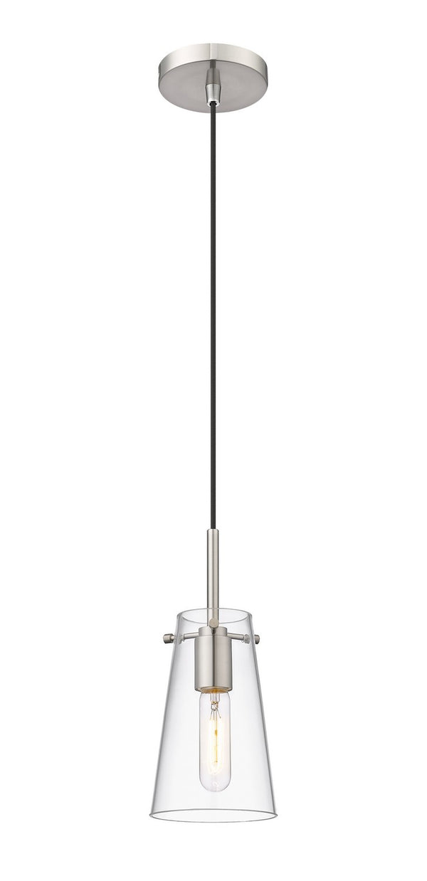 Clear glass defines a slim silhouette, bringing refined style to a modern one-light pendant. Its sleek brushed nickel finish sets the tone for a refined living space, kitchen or powder room. The gentle tapering cone silhouette of the pendant ensures its timeless look, perfect alone or in series lighting a larger space.
