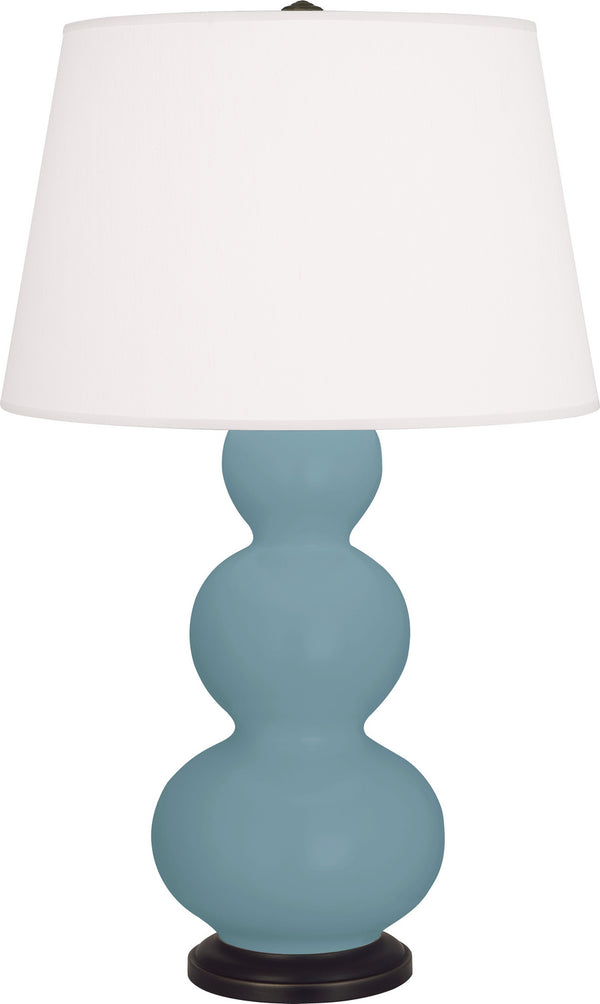 Our Triple Gourd collection features a simple but gracefully curving silhouette. Available in a wide array of vibrant colors and several different base finishes. -Lily Glazed Ceramic With Antique Natural Brass Finished Accents Triple Gourd Table Lamp With Pearl Dupioni Fabric Shade