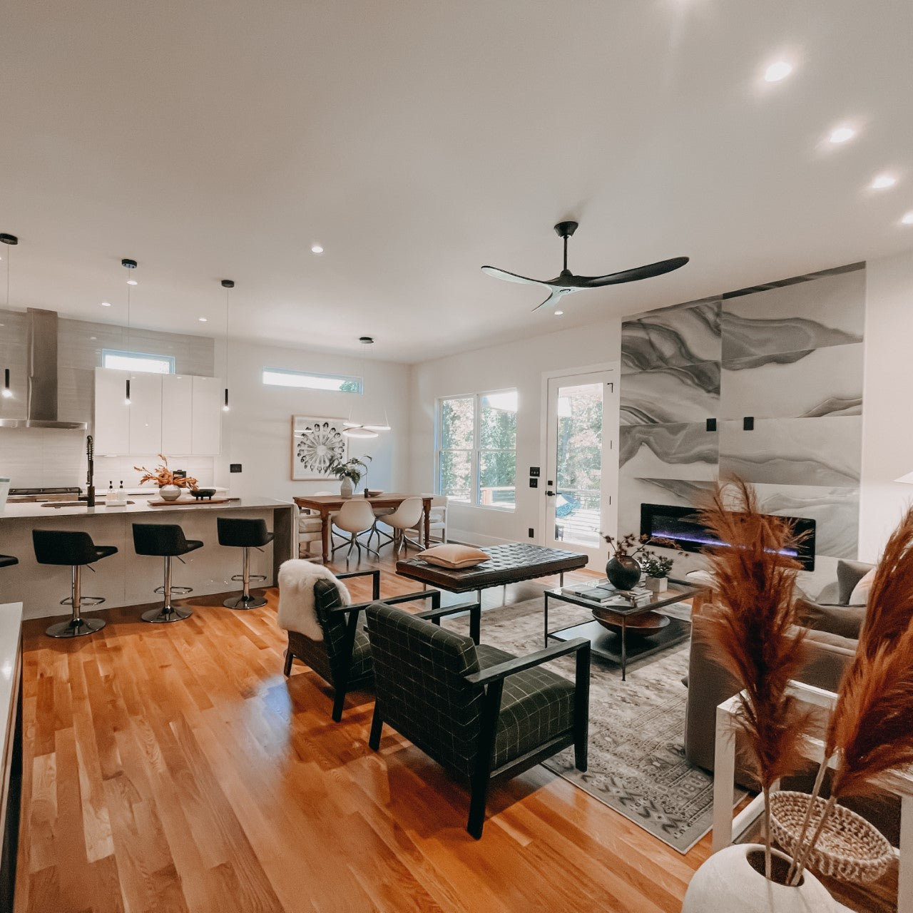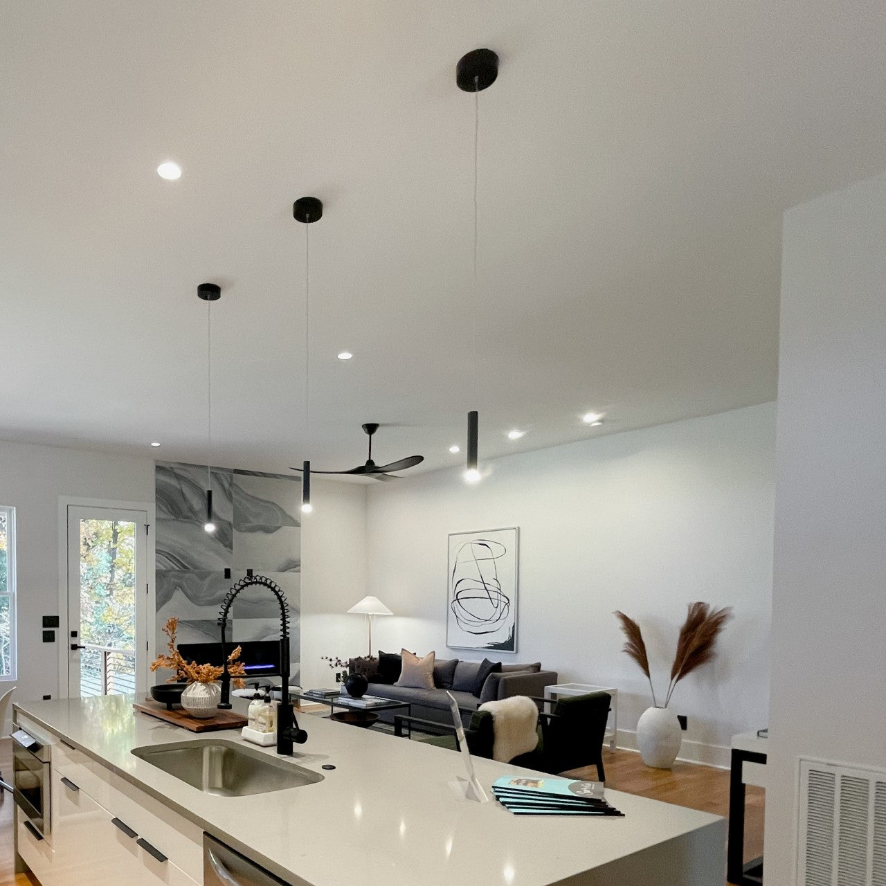 New Path Properties came to us to discuss how he was building a spec-home, but didn't want to skimp. He didn't want a "builder grade" feel, but didn't need top of the line either. Since spec homes don't have owners yet, there is a general simplicity we keep in the area, knowing we won't know the future homeowner's lifestyle or even art placement yet. Therefore, we use quality products with good warranties, placement based on the specs of the products, and a decorative look to keep the overall modern feel the builder wanted in mind.