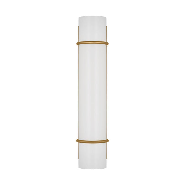 The Amelie Integrated LED vanity series by Chapman & Myers is a simplified cylindrical linear bath light with two metal rings inspired by a vintage cuff bracelet. Each sconce has a cylindrical glass shade accented by two metal rings on either end of the sconce and a metal back plate. Amelie is illuminated with custom-led panels to provide an even glow through the white glass shades. Available in three sizes and three finish options. Dimmable Integrated LED lamping with Damp location rating.