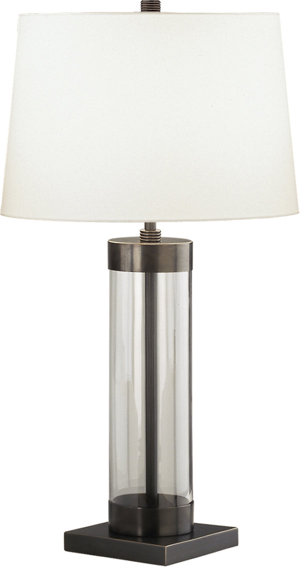 Clear Glass Cylinder With Deep Patina Bronze Accents Andre Table Lamp With Off White Cotton Shade with Rolled Edge Hem - Our Andre collection is classic and bold! This design utilizes transparency and contrast to create harmony. Andre will compliment any space and fits great with transitional or contemporary decor.