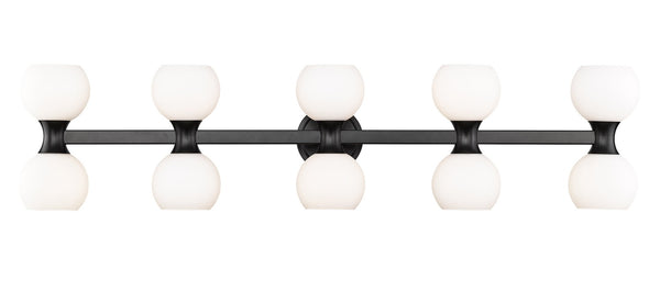 Dazzle a modern or transitional setting with custom lighting in the form of a 10-light vanity light perfect for both ensuites and guest bath spaces. From the Artemis collection comes a fun redo of Mid-Century Modern style in a linear brushed nickel finish steel frame and center curved holders clinging to delicate matte opal glass globe shades. Adding both uplighting and down lighting that crowns a spacious vanity, this transitional vanity light becomes a focal point.