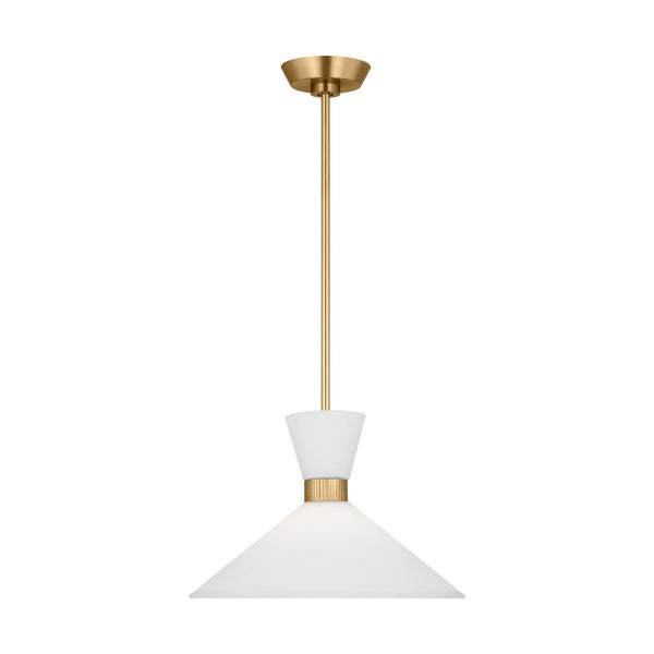 Inspired by playful mid-century modern design, the Drew & Jonathan Belcarra Medium Pendant is accentuated by a flared glass shade with ribbed metal details and etched white glass that bestows an almost whimsical touch to the clean design. Available in three finishes, Brushed Steel, Midnight Black, and Satin Brass, the Belcarra looks great on its own or when grouped in multiples. This product may be mounted on a sloped ceiling and is cETL listed for damp locations, making it the perfect lighting solution for any space.