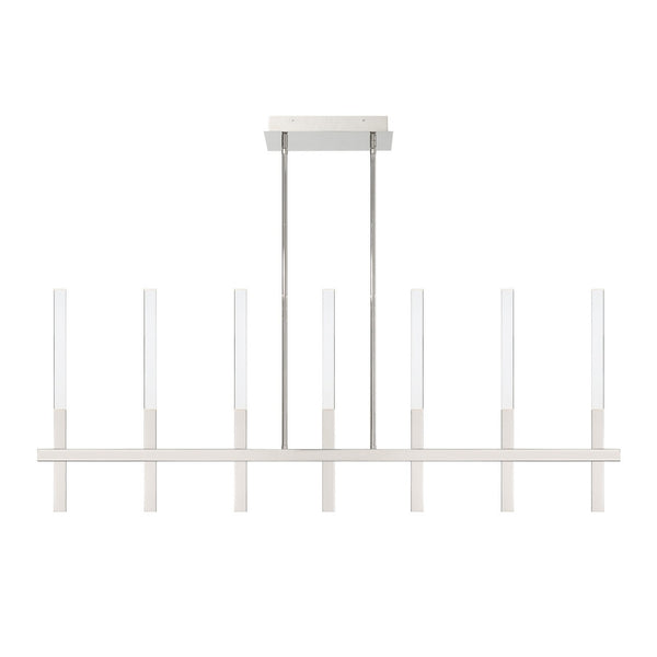 Its crystal rectangular prism and sharp beveled edges create brilliant illumination to the Benicio collection. Solid glass vertical spires cast vivid refractions across wall and ceiling surfaces. The thin simple geometric shape lends itself to luxurious and contemporary environments while providing a dual LED light source.