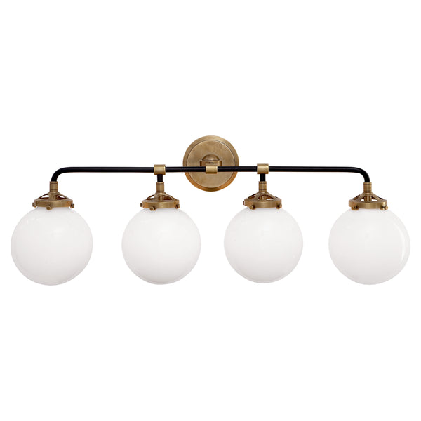 Bistro Four Light Bath Sconce in Hand-Rubbed Antique Brass and Black with White Glass