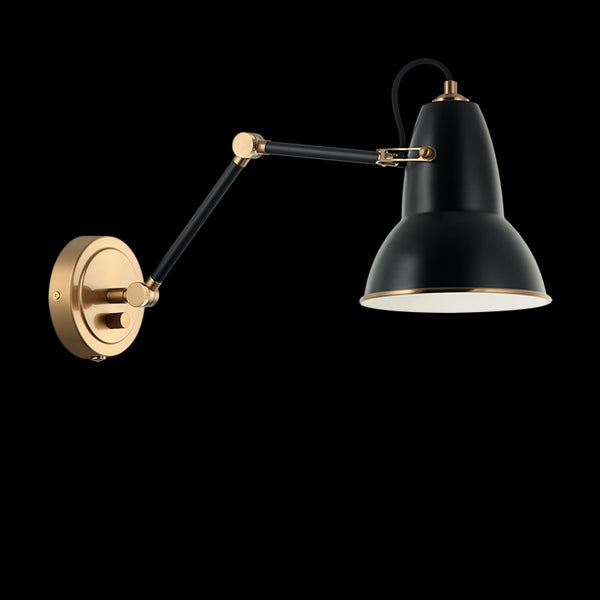 A playful yet sophisticated wall sconce collection. Designed with a dome shaped adjustable shade with Aged Gold Brass trim. This is extended with an adjustable arm. Features a built in dimmer, and available in 2 finish combinations and 2 sizes.