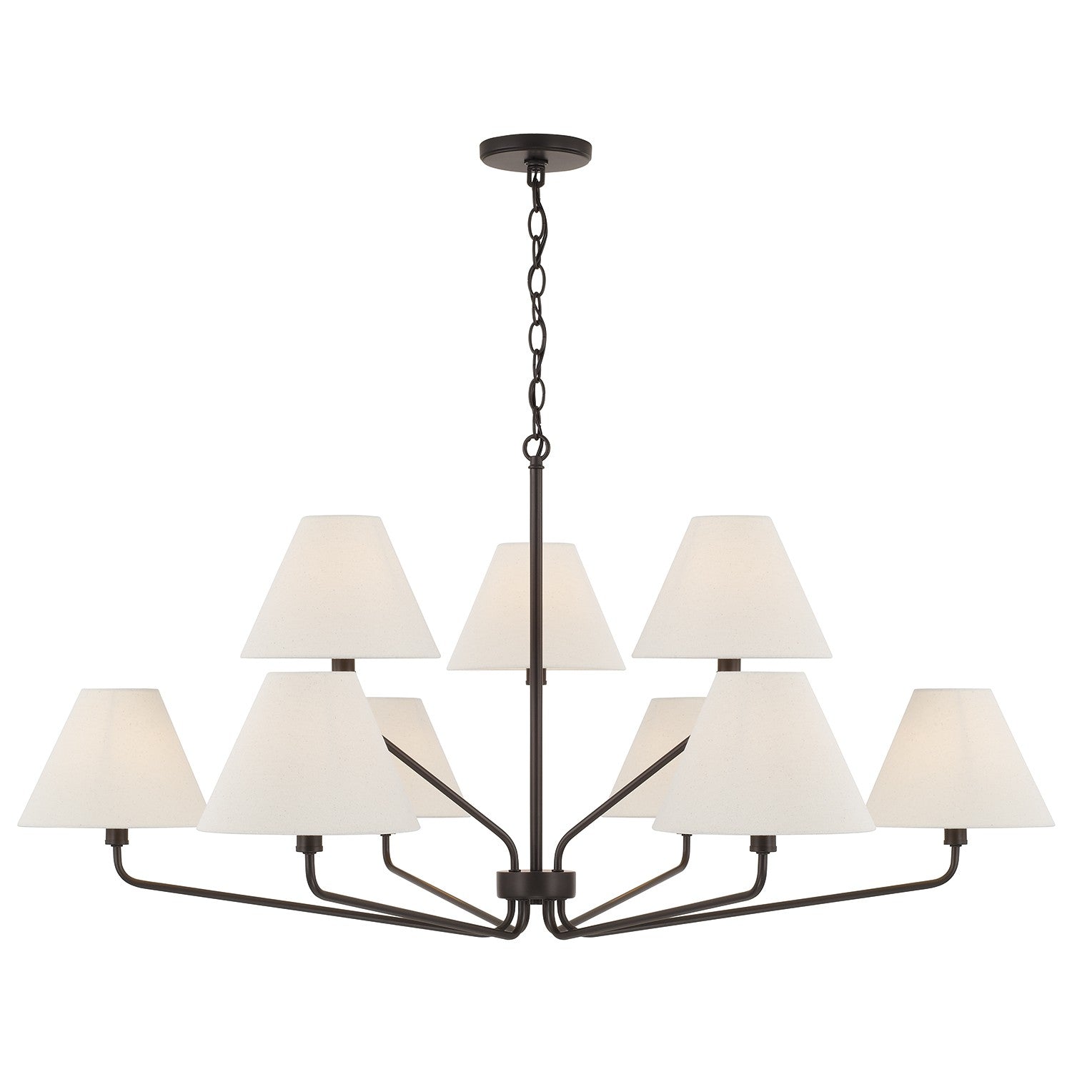 Soft angles and classic style create the Chadwick Medium Chandelier. The tapered White fabric shades bring a visual balance to the elegant metal arms, finished in Aged Brass for a mid-century touch of shine.