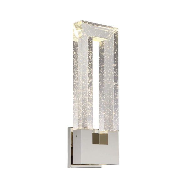 An upscale lobby, a theater, a luxury bath—they're all natural settings for Chill, a radiant sconce anywhere you mount it. The design is crafted from solid crystal, cut and perfectly mitered at the corners. The seeded bubbles within shimmer with powerful LED light for a stunning visual effect enhanced by the polished nickel finish of the frame.