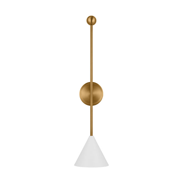 The Cosmo series by AERIN for Visual Comfort Studio Collection plays with asymmetry, combining milk glass globes that emit a soft glow, and metal cone shades, which focus light above and below.