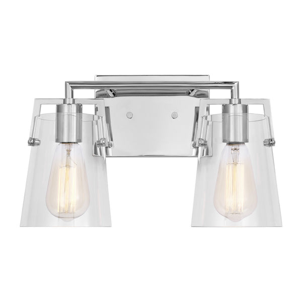 Add a bright burst of light where you need it most with the stylish Drew & Jonathan Crofton Two Light Wall / Bath Sconce, featuring a sleek rectangular metal backplate and clear glass shades. Made to coordinate across a broader range of bath hardware and design styles, the Crofton is available in four popular finishes, Brushed Steel, Chrome, Midnight Black, and Satin Brass. This light looks great on its own or installed above a bathroom vanity, and the glass shades make it ideal for filament bulbs. This fixture may be mounted in the up or down position, and is cETL listed for damp locations, making it the perfect lighting solution for any space.
