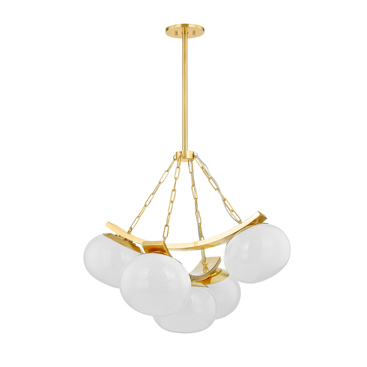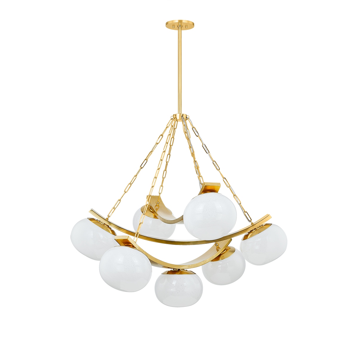 Balancing hard and soft elements, Duxbury creates a modern architectural lighting experience inspired by morning dew collecting on blades of grass. Voluminous cloud seedy glass shades are suspended from stark metal bands and chains, creating a powerful yet pleasing contrast. Duxbury is available as a 5 or 7-light chandelier with an Aged Brass or Distressed Bronze finish.