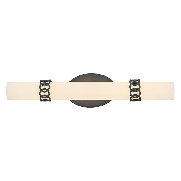 Reminiscent of the fanciful detailing found in fine jeweled bracelets, Eliza's decorative chain cuffs accentuate its tasteful etched opal glass. Fully dimmable integrated LEDs evenly cast bright yet comfortable illumination to fill your entire bathroom or living space.