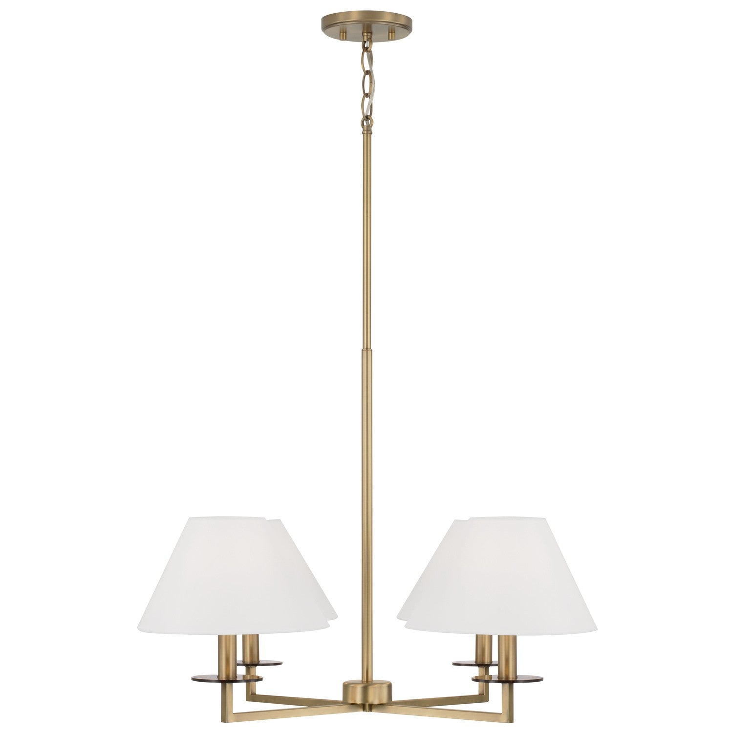 Decadence is in the details. The Gilda Small Chandelier brings the glamour with interchangeable tortoise shell or clear acrylic bobeches. The Aged Brass finish adds a warm tone, while the tapered White fabric stay-straight shades and squared arms create a crisp, classic aesthetic.