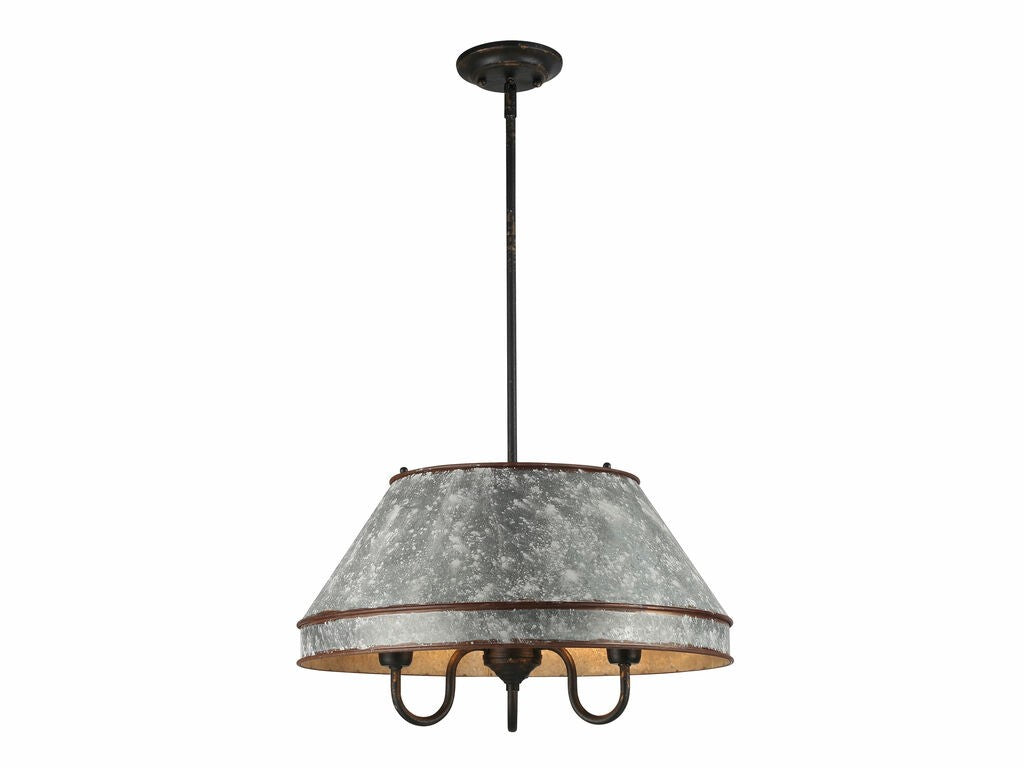 Bring traditional elegance into your home with the Wry Lighting Jasper 3-light Pendant in Antique Black Iron. Featuring a metal shade and a rustic Antique Black Iron frame, it creates a welcoming atmosphere. This weathered metal shade features a heavily textured galvanized steel exterior in mottled gray with chalky white speckles and rust accents, perfectly complementing the antiqued golden-orange interior that emits warm light. Capture the raw charm of a bygone era with the Antique Black Iron finish, artfully weathered to reveal glimpses of a warm, antiqued gold base beneath. This bold finish is perfect for adding a handcrafted character to your space. Ideal for indoor spaces like kitchens, dining rooms, or bedrooms, the pendant is dry location rated for areas not subject to moisture. Installation is simple with sloped-ceiling compatibility, and the adjustable height ranges from 56.5 to 11.75 inches. Overall Dimensions: 21"W x 56.5"H x 21"D. Requires 3 E26 Medium base bulbs (not included), max 60 watts per bulb. This handcrafted piece not only illuminates but also adds unique character to your home.