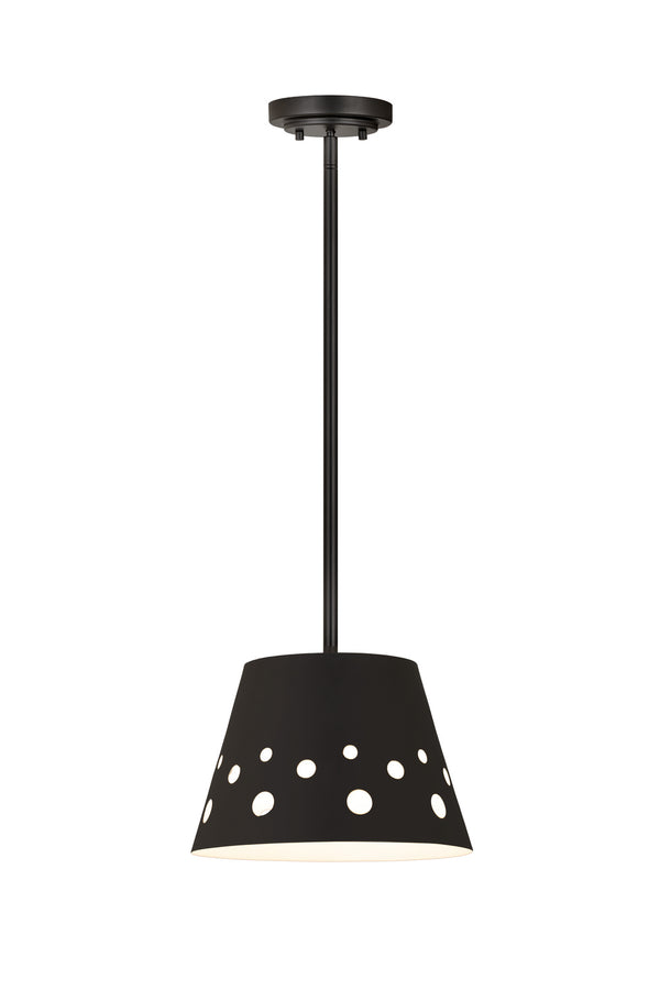The festive design of the Katie one-light mini-pendant offers inspiring attitude to dress up a casual space. Crafted of matte black finish iron, this delightful fixture features a sleek conical shade with cutout holes that let light shine through. Punctuate a favorite dining space, kitchen, or nook with this pendant that offers adjustable hanging lengths and may be mounted on a sloped ceiling.