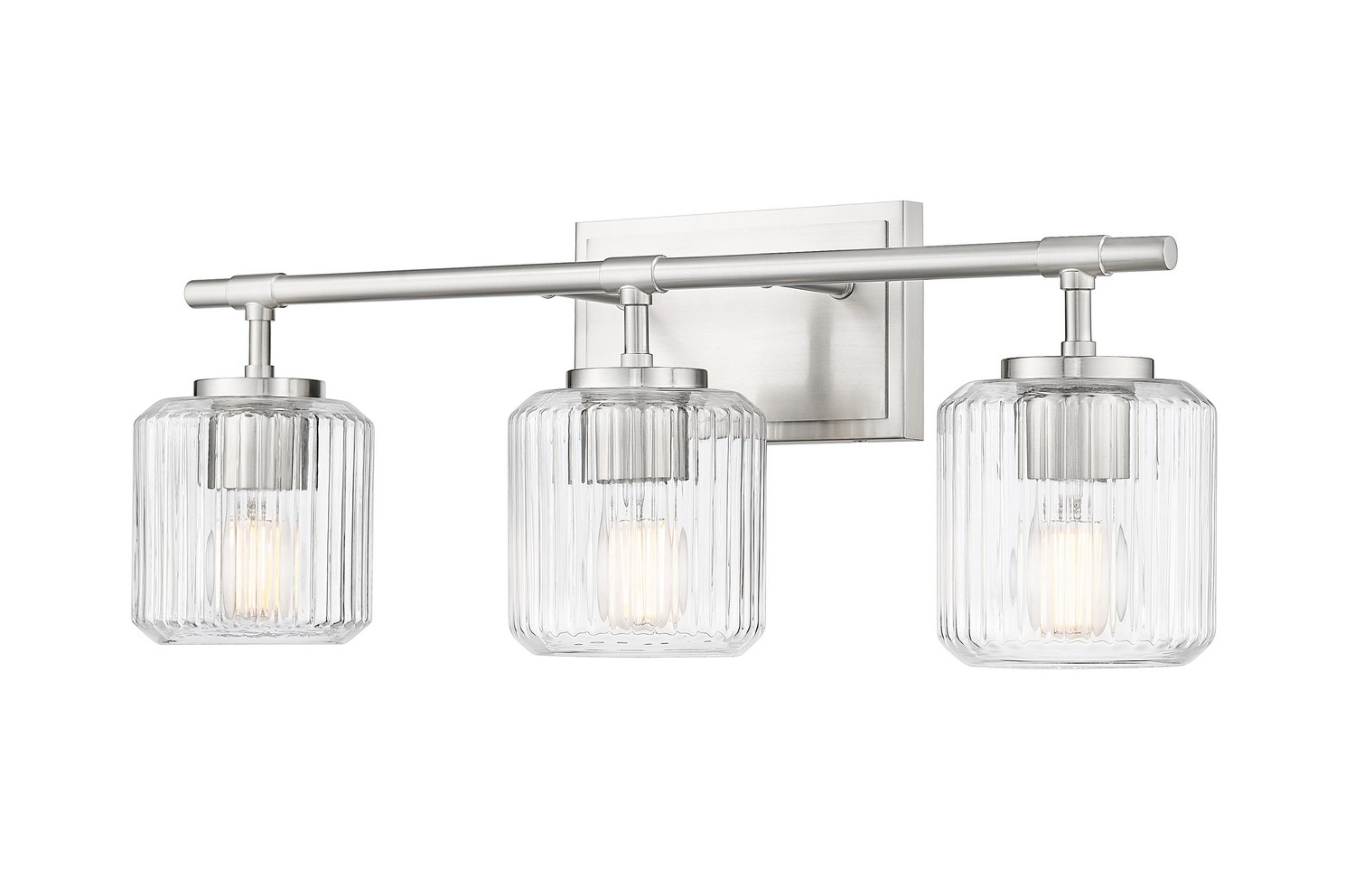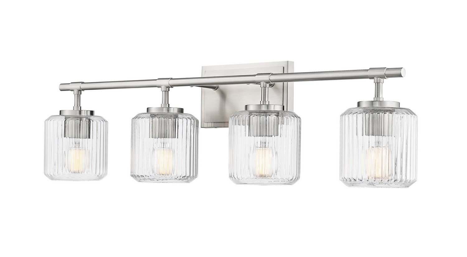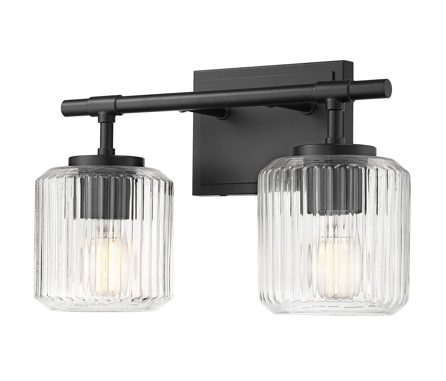 Sparkling ribbed glass creates a soft, undulating effect for this modern two-light vanity bath light. Beautiful in contemporary, transitional, and traditional settings, it showcases a simple wall plate and straight arms, all in a soft brushed nickel finish that's sure to complement in any setting.